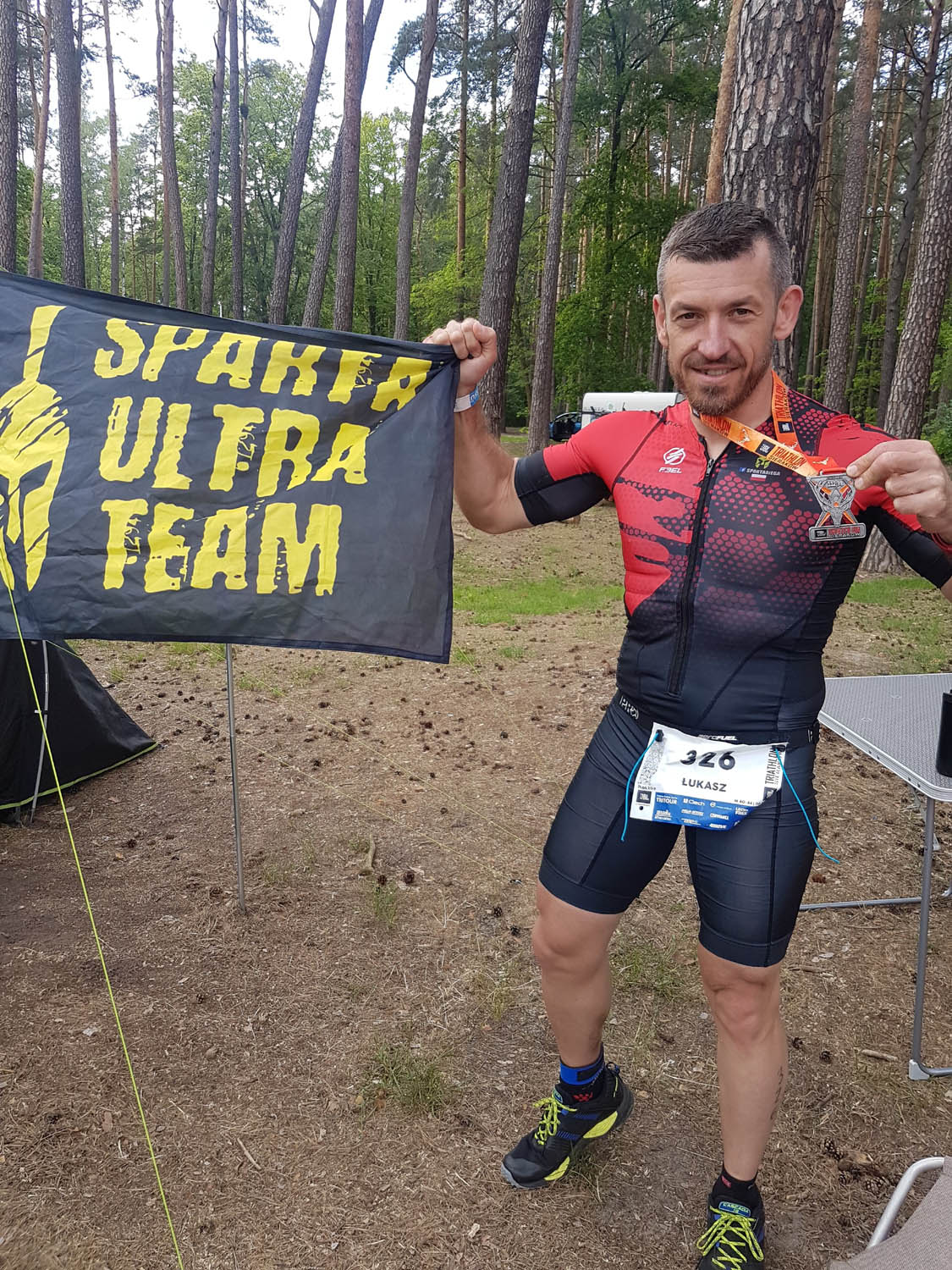Na pierwszej pętli dowiaduje się o co chodziło w opisywaniu przez innych tej trasy, tak... jest ciężka, piaszczysta i ma dużo podbiegów. Na końcu pętli legendarny już chyba kręty podbieg wijący się jak wąż, na szczęście jest tam dużo kibiców, którzy motywują a na ostatnim zakręcie baner z napisem ,,This is SPARTA" - tak, to daje kopa 😃. I tak 4 razy 😃. Oczywiście moje kibicki też czekają, krzyczą i mocno mnie wspierają na każdym kółku.
