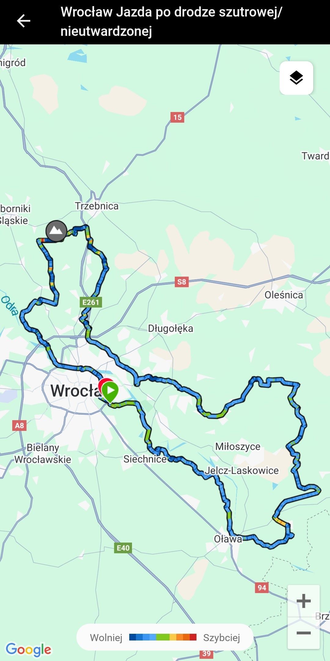 Jak już pisałem, trasa była szybka, ale było kilka ciekawych odcinków specjalnych w postaci – krótkich, bo krótkich – ale za to kilkunasto(!)procentowych podjazdów i zjazdów 🔥, wjazdu na górę pod Trzebnicą z pięknym widokiem na Wrocław 🌄, czy kilku błotnisto-łąkowych odcinków z kałużami, mogącymi pochłonąć w całości cyklistów o tyle nierozważnych, by w nie wjechać 😉.